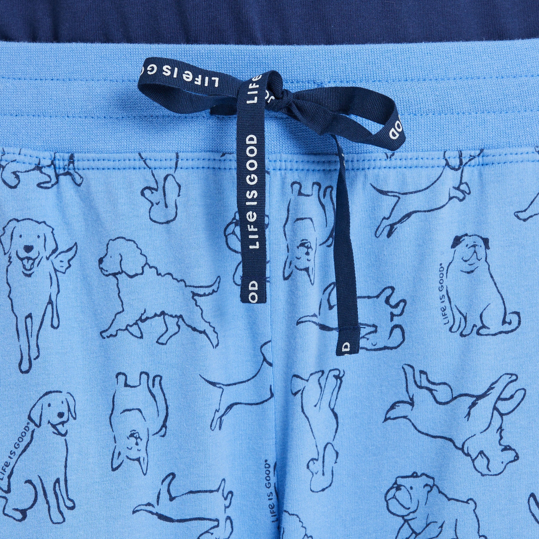 • Elastic encased rib waistband. Twill drawcord with Life Is Good® print.